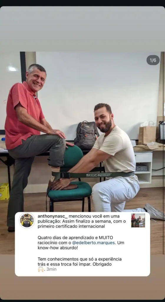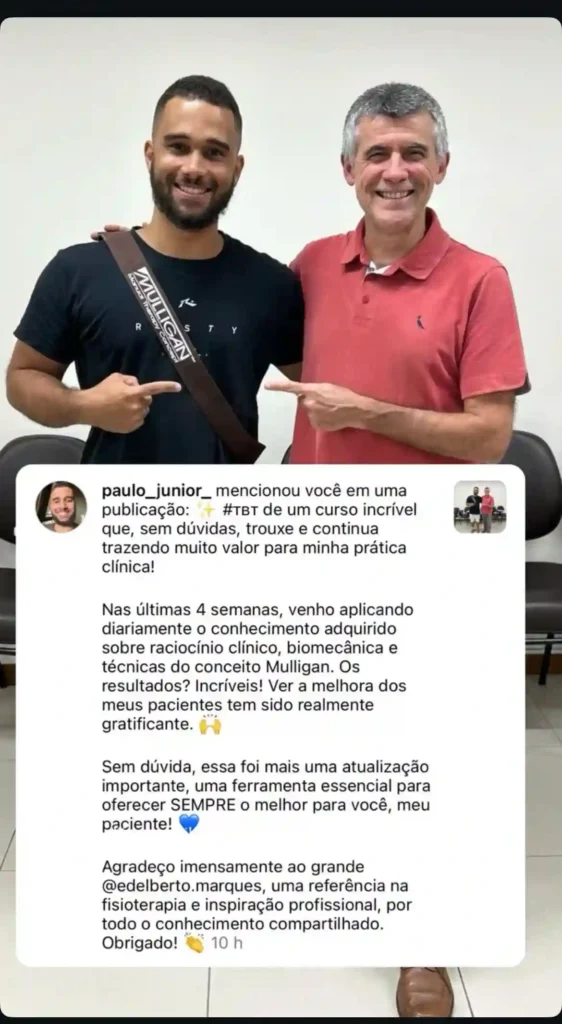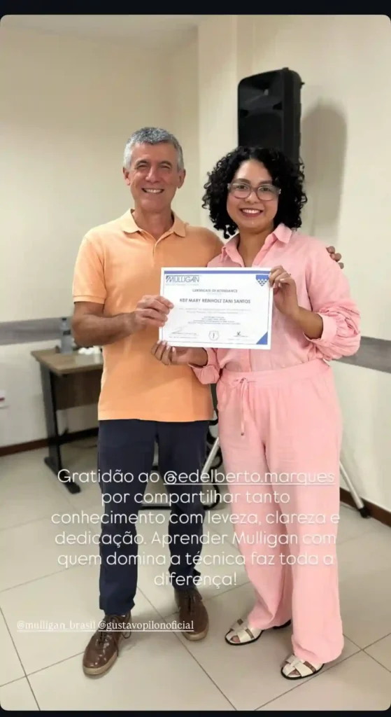“Assim que fiz o curso, percebi que era completamente diferente de tudo que havia aprendido na faculdade. Esse foi meu divisor de águas: comecei bem na fisioterapia, com um conceito moderno para a época e moderno até hoje — porque poucas pessoas ainda conhecem a facilidade da aplicação do Conceito Mulligan.”